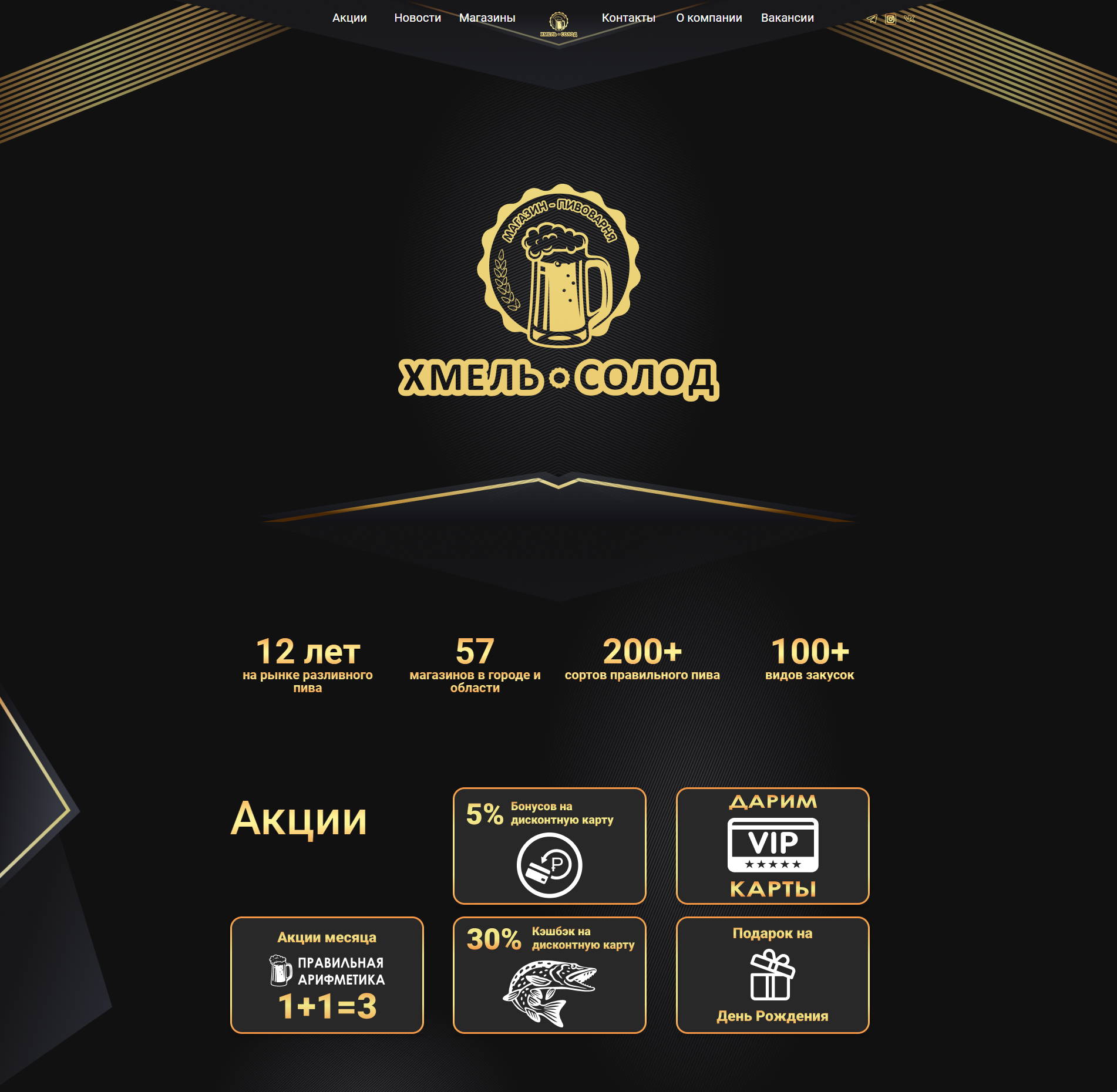 Разработать фирменный сайт сети магазинов пива "Хмель-Солод", который станет эффективным представительством в интернете и поможет в развитии бизнеса.